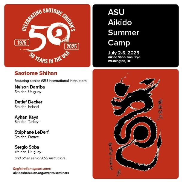Join Aikido Shobukan Dojo at our annual Summer Intensive, July 2-6, 2025! Continuing our year of celebrations, we’re honoring Saotome Sensei’s 50th year in the USA.